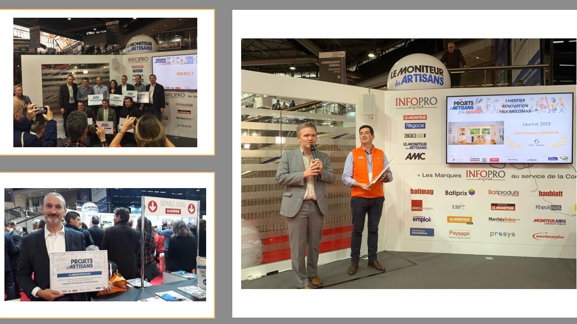 Remise des Trophées Projets d’artisans 2019 sur le stand du Moniteur des Artisans le 07 novembre à BATIMAT. Jean-François LAMARCHE de la Société CLIMENSERVICES lauréat dans la catégorie ‘Chantier Rénovation’…
