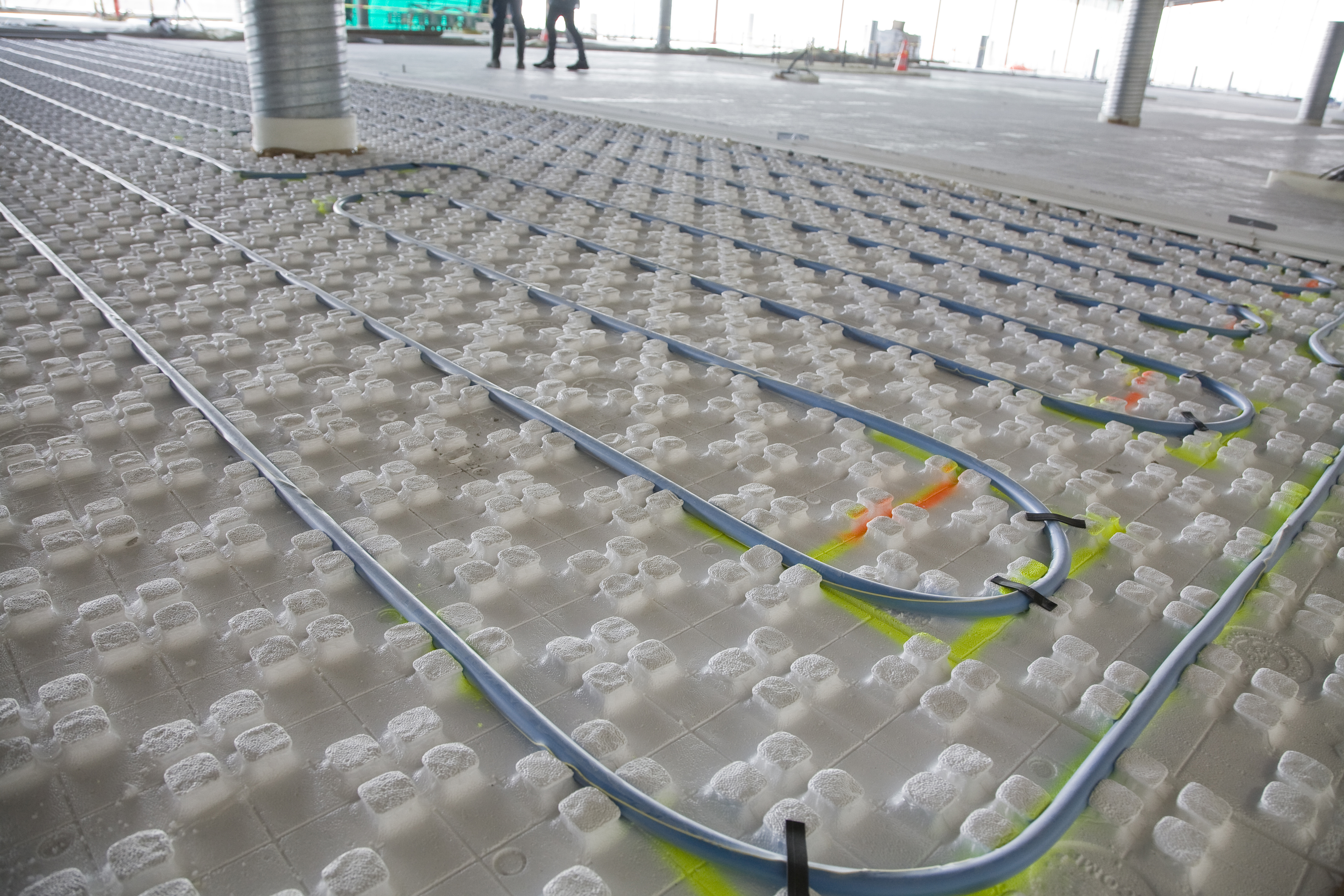 50 km de tubes PEXc Ecotube® avec fil de détection ont été déployés, 1000 carottages après repérage du tube (fixations de cloisons au sol, pasages de gaines, évacuations,….).