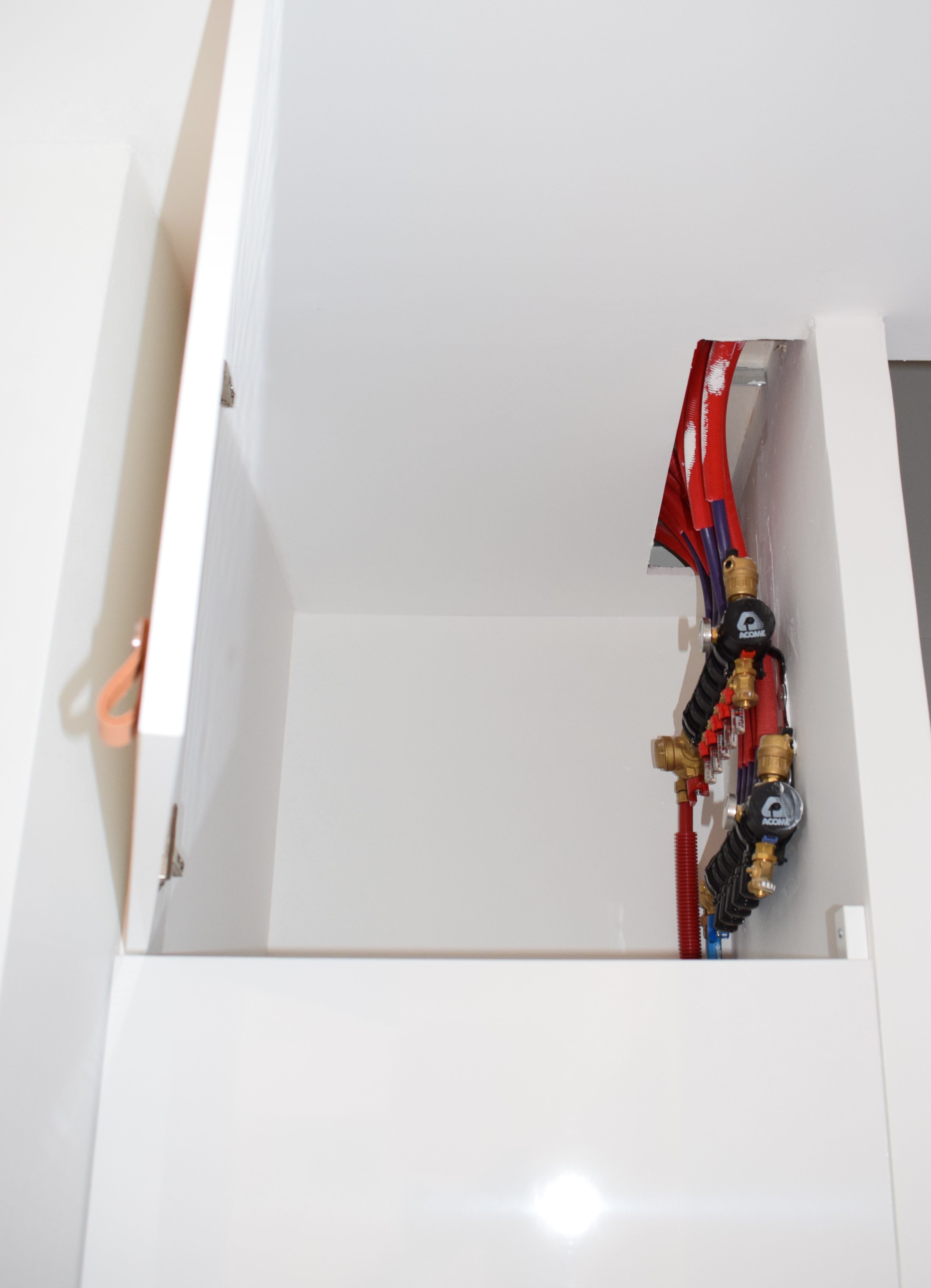 La villa toulousaine rénovéeDe grandes baies vitréesLa montée d’escalier est également rafraîchie par le plafond chauffant-rafraîchissant !Le colecteur de l’étage, totalement camouflé dans un placardDans la salle de bains, la douche est aussi traitée, ce qui est impossible en plancher chauffant du fait de la présence du receveur !Les excellents COP de la pompe à chaleur