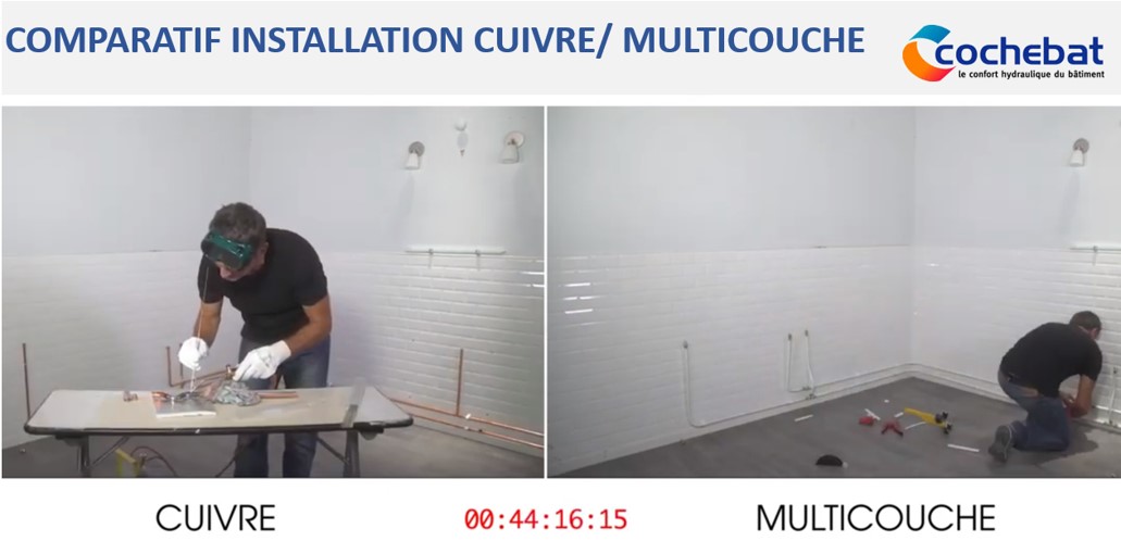 Gagnez du temps avec le multicouche ! Comparatif de l”installation d’un réseau sanitaire dans une salle de bain en cuivre et en multicouche.